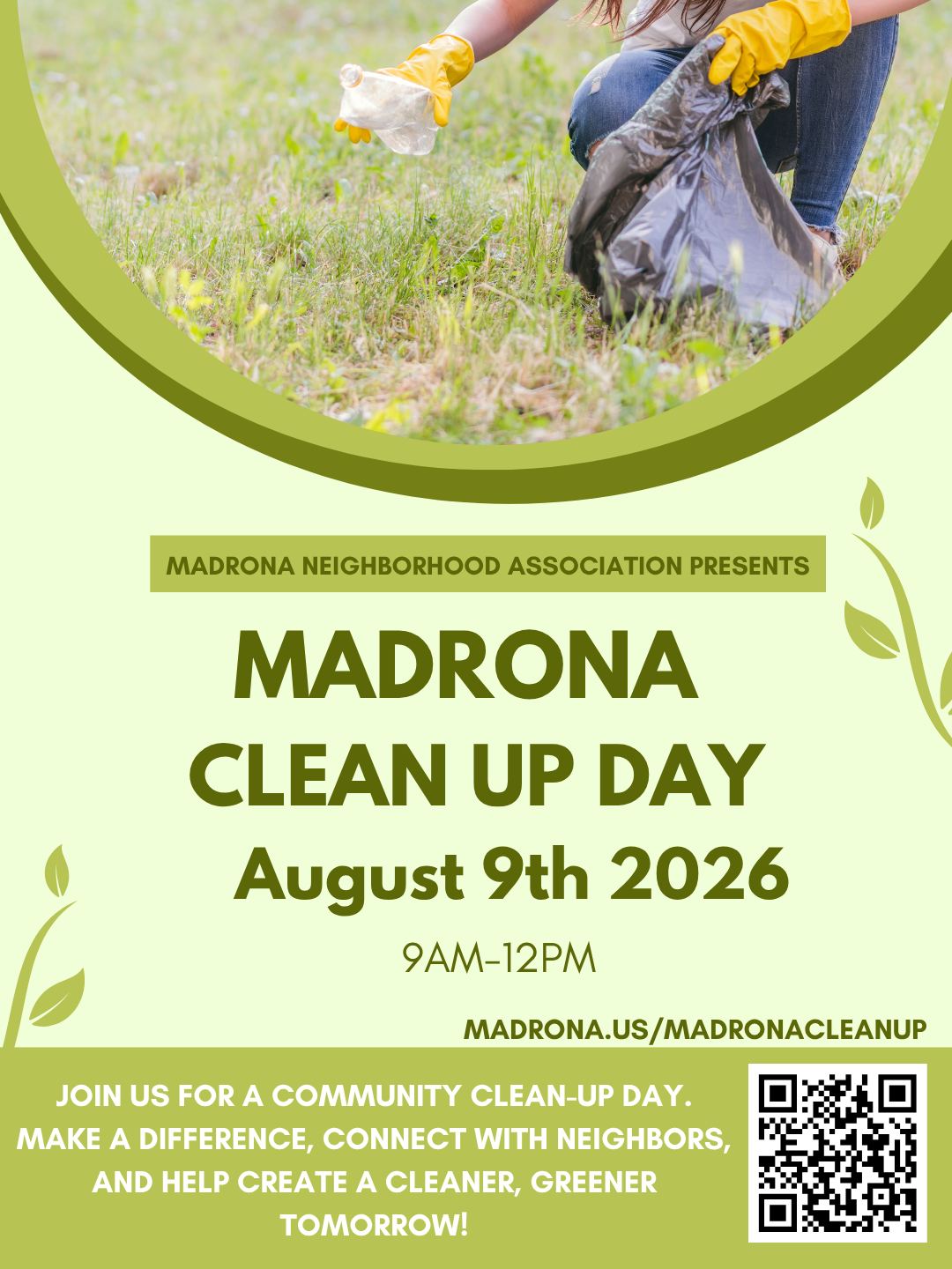 Madrona Clean Up Day – August 9th, 9am–12pm Join us for a neighborhood clean-up! Choose which location you would like to sign up for on the form below!