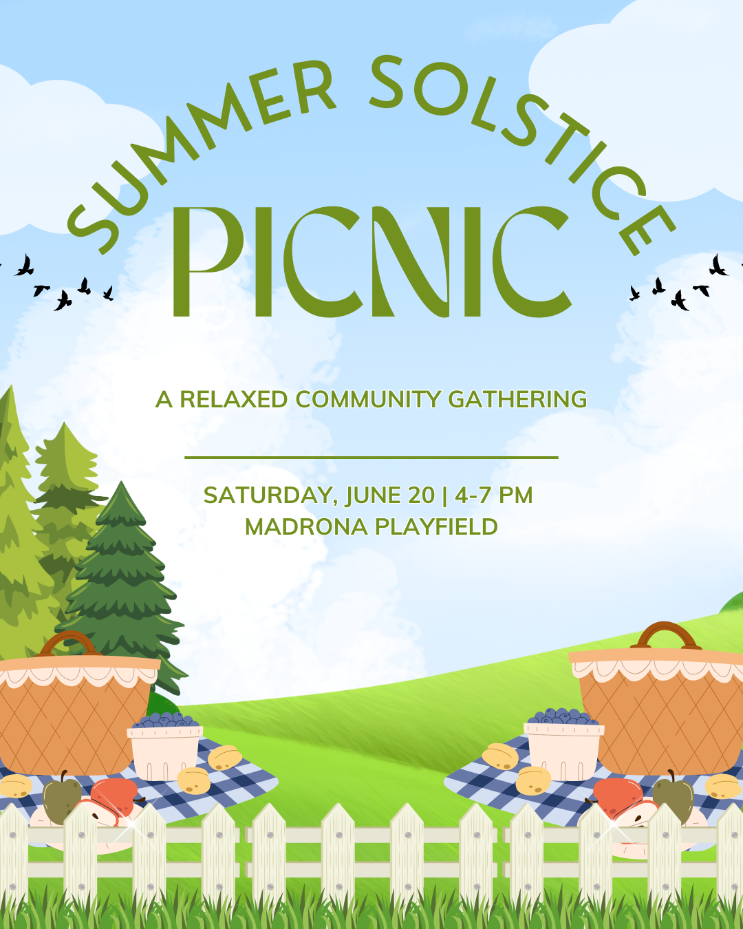 Summer Solstice picnic A Relaxed Community Gathering Saturday, June 20, 20264-7 PMJoin us for a relaxed Summer Solstice picnic and celebrate the longest day of the year with neighbors and friends. Bring a blanket, pack a bite to eat, and enjoy an easygoing evening of sunshine, conversation, and community.