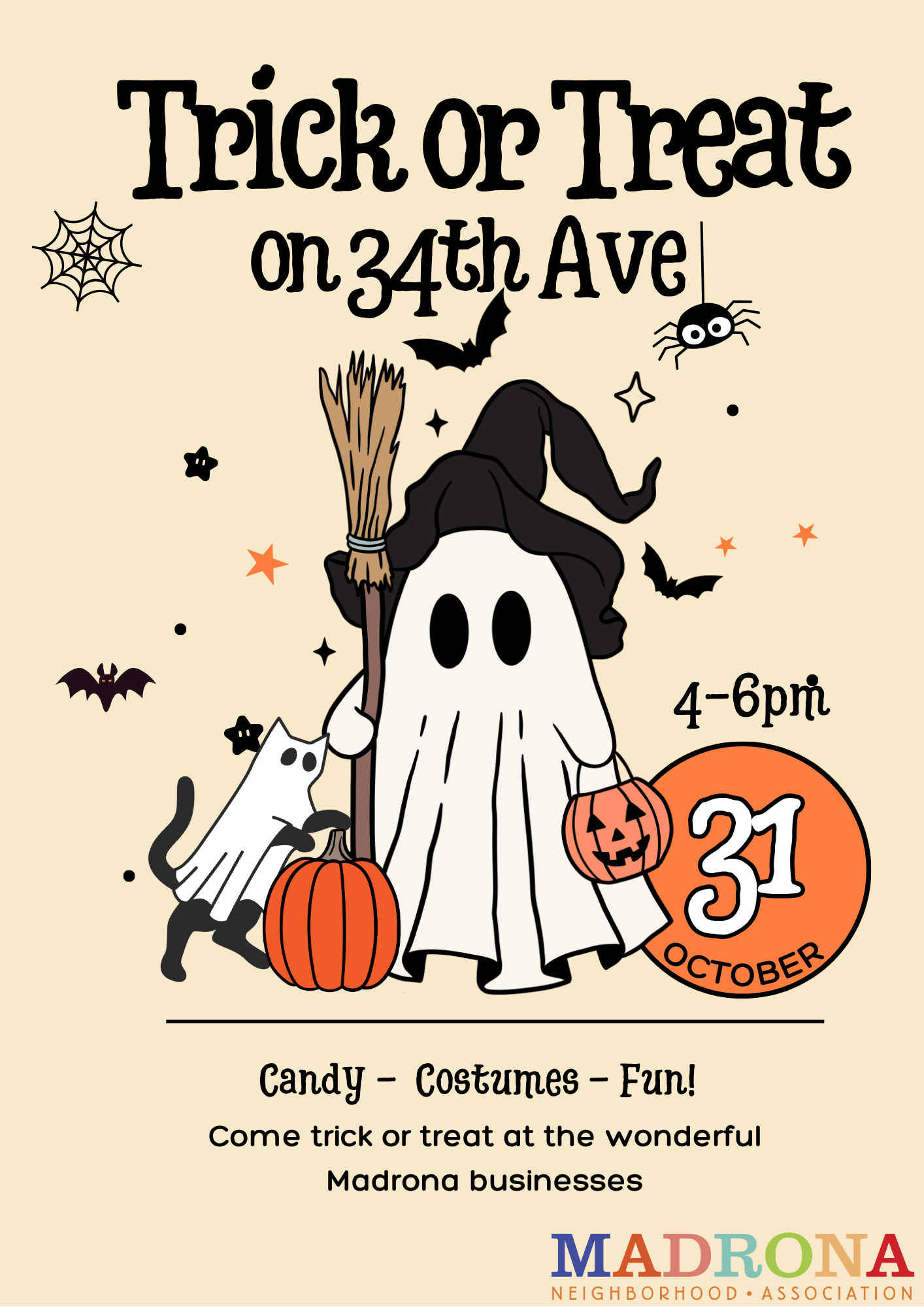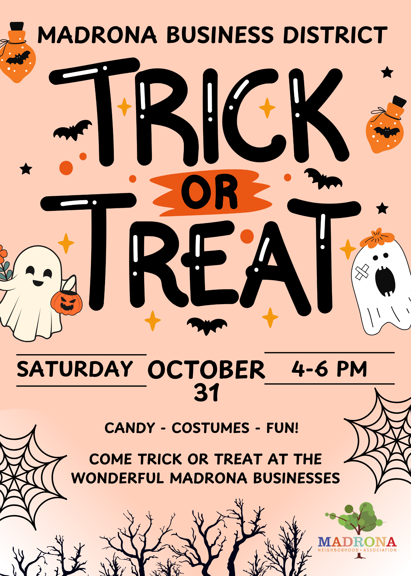 Join us for a fun and festive Halloween in the Madrona business district! Local shops and restaurants will be handing out candy and special treats to trick-or-treaters of all ages. Stroll the neighborhood, show off your costumes, and enjoy this beloved community tradition!