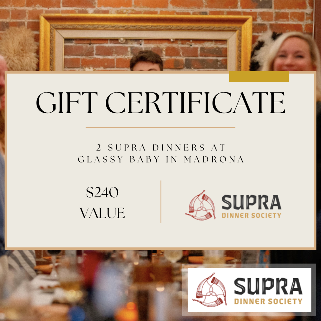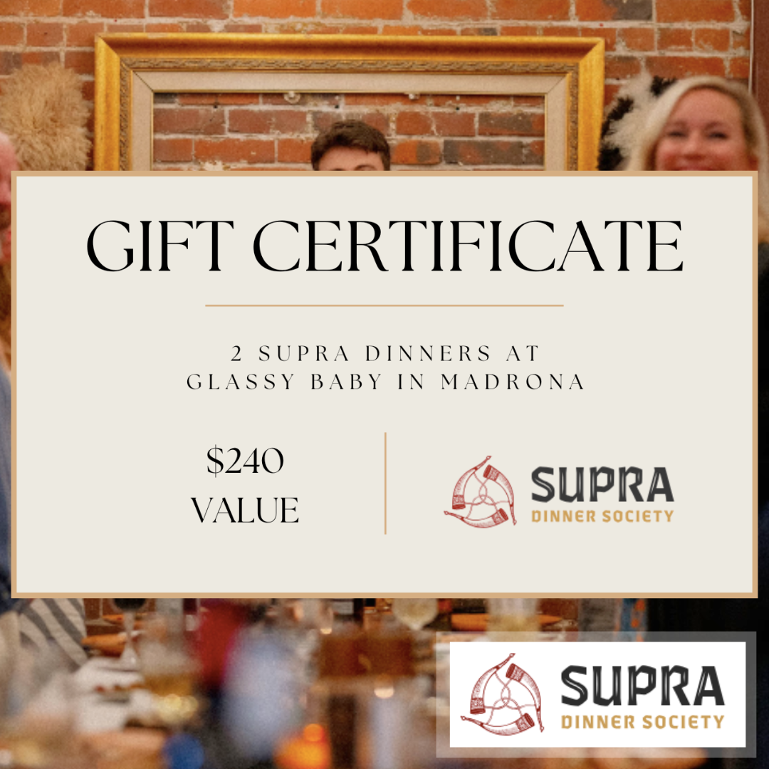 •Supra Dinner Society– 2 Supra Dinners at Glassy Baby in Madrona ($240 Value)