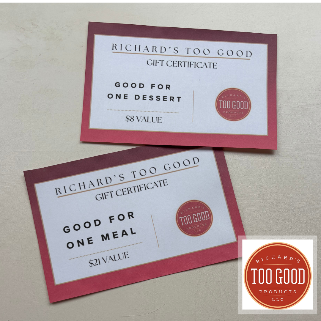 •Richard’s Too Good– Gift Certificates for 3 Meals & 2 Desserts ($79 Value)